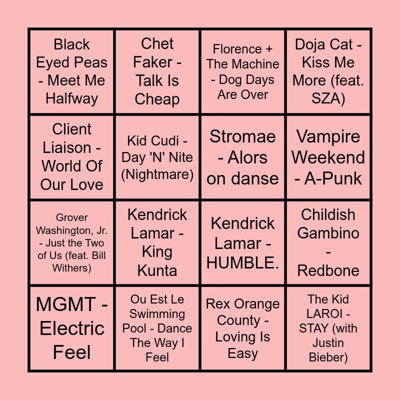 This bingo card has 59 words: Earth, Wind & Fire - Let's Groove, Rockwell - Somebody's Watching Me, Glass Animals - Heat Waves, The Kid LAROI - STAY (with Justin Bieber), Lil Nas X - INDUSTRY BABY (feat. Jack Harlow), George Michael - Careless Whisper, Stromae - Alors on danse, Gym Class Heroes - Cupid's Chokehold, Grover Washington, Jr. - Just the Two of Us (feat. Bill Withers), Destiny's Child - Bills, Bills, Bills, Doja Cat - Kiss Me More (feat. SZA), Britney Spears - Gimme More, Kid Cudi - Day 'N' Nite (Nightmare), Lil Nas X - MONTERO (Call Me By Your Name), Olivia Rodrigo - good 4 u, Black Eyed Peas - Meet Me Halfway, MGMT - Electric Feel, Client Liaison - World Of Our Love, Flight Facilities - Foreign Language, Vampire Weekend - A-Punk, Ou Est Le Swimming Pool - Dance The Way I Feel, Florence + The Machine - Dog Days Are Over, Ball Park Music - It's Nice To Be Alive, The Wombats - Let's Dance to Joy Division, Prince - I Wanna Be Your Lover, Room 5 - Make Luv, Madonna - Holiday, Post Malone - Congratulations, Kendrick Lamar - King Kunta, Kanye West - Stronger, Nelly Furtado - Maneater, Touch Sensitive - Lay Down, Gang of Youths - Magnolia, Flume - Never Be Like You, Chet Faker - Talk Is Cheap, Kanye West - Runaway, M83 - Midnight City, Childish Gambino - Redbone, Disclosure - Latch, Kendrick Lamar - HUMBLE., Arctic Monkeys - Why'd You Only Call Me When You're High?, J. Cole - No Role Modelz, Rex Orange County - Loving Is Easy, THE ANXIETY - Meet Me At Our Spot, The Weeknd - Blinding Lights, Elton John - Tiny Dancer, Riton - Friday (feat. Mufasa & Hypeman), Justin Bieber - Peaches (feat. Daniel Caesar & Giveon), Fat Joe - What's Luv? (feat. Ja-Rule & Ashanti), Rihanna - We Found Love, Tears For Fears - Everybody Wants To Rule The World, Gorillaz - Feel Good Inc., Far East Movement - Like A G6, Camila Cabello - Havana (feat. Young Thug), Joel Corry - Head & Heart (feat. MNEK), Gloria Gaynor - I Will Survive, Genesis Owusu - Good Times, My Chemical Romance - Welcome to the Black Parade and All Time Low - Dear Maria, Count Me In.