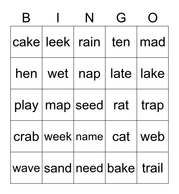 This bingo card has 47 words: meet, seed, feed, need, week, beet, leek, red, hen, pen, wet, ten, web, cat, mat, jam, nap, rat, hat, mad, map, bake, cake, late, take, lake, wave, same, name, crab, slap, sad, dad, plan, cap, sand, trap, snail, paint, tail, trail, rain, play, tray, hay, clay and pet.