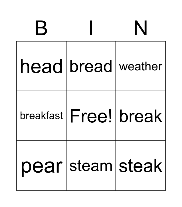 This bingo card has a free space and 12 words: clean, bear, steak, break, bread, weather, steam, beach, head, breakfast, pear and flea.