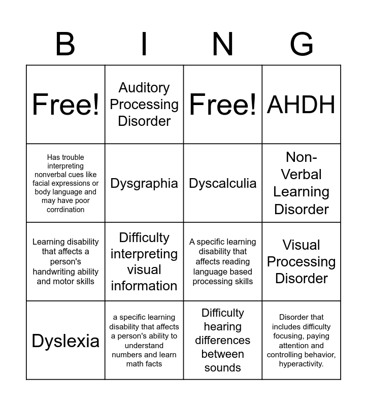 This bingo card has 16 words: Dyslexia, a specific learning disability that affects a person's ability to understand numbers and learn math facts, Free!, AHDH, Has trouble interpreting nonverbal cues like facial expressions or body language and may have poor corrdination, Auditory Processing Disorder, A specific learning disability that affects reading language based processing skills, Visual Processing Disorder, Free!, Dysgraphia, Difficulty hearing differences between sounds, Non-Verbal Learning Disorder, Learning disability that affects a person's handwriting ability and motor skills, Difficulty interpreting visual information, Dyscalculia and Disorder that includes difficulty focusing, paying attention and controlling behavior, hyperactivity..