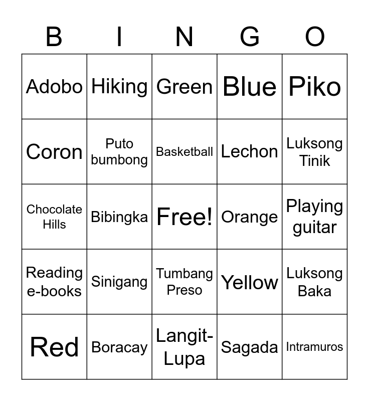This bingo card has a free space and 24 words: Sinigang, Boracay, Basketball, Red, Piko, Adobo, Coron, Hiking, Orange, Tumbang Preso, Lechon, Chocolate Hills, Yellow, Luksong Baka, Puto bumbong, Sagada, Playing guitar, Green, Luksong Tinik, Bibingka, Intramuros, Reading e-books, Blue and Langit-Lupa.