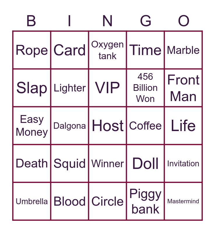 This bingo card has 25 words: Squid, Circle, VIP, Umbrella, Marble, Rope, Slap, Card, Coffee, Winner, 456 Billion Won, Easy Money, Doll, Invitation, Lighter, Mastermind, Life, Oxygen tank, Front Man, Dalgona, Host, Blood, Death, Time and Piggy bank.