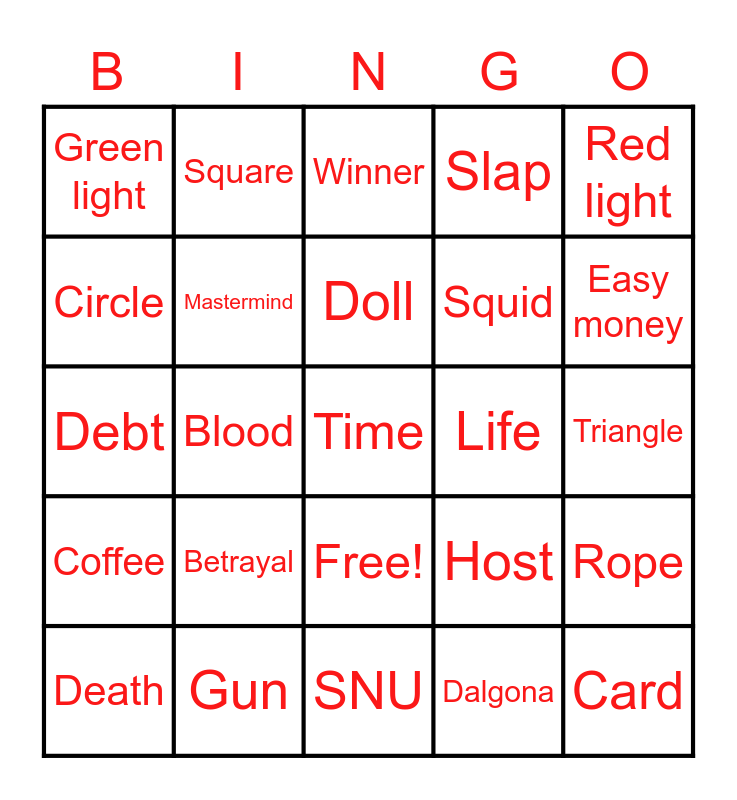 This bingo card has 26 words: Free!, Dalgona, Doll, Gun, Red light, Green light, Circle, Square, Triangle, Host, Squid, Debt, Rope, Death, Blood, Umbrella, Slap, Coffee, Winner, Time, Easy money, SNU, Life, Betrayal, Mastermind and Card.