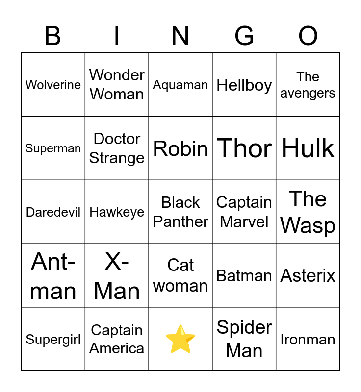 This bingo card has 25 words: Ant-man, Captain America, Black Panther, Spider Man, The avengers, Wolverine, Wonder Woman, Aquaman, Captain Marvel, Asterix, Superman, Doctor Strange, ⭐️, Batman, Hulk, Supergirl, Hawkeye, Robin, Thor, The Wasp, Daredevil, X-Man, Cat woman, Hellboy and Ironman.