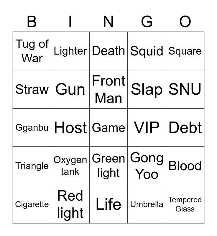 This bingo card has 40 words: Dalgona, Gganbu, Doll, Gun, Red light, Green light, Front Man, Circle, Square, Triangle, Host, Squid, Game, Debt, VIP, Oxygen tank, Marble, Tug of War, Rope, Death, Blood, Umbrella, Slap, Straw, Coffee, Card, 456 Billion Won, Winner, Tempered Glass, Time, Piggy bank, Cigarette, Easy money, Gong Yoo, SNU, Life, Invitation, Betrayal, Lighter and Mastermind.