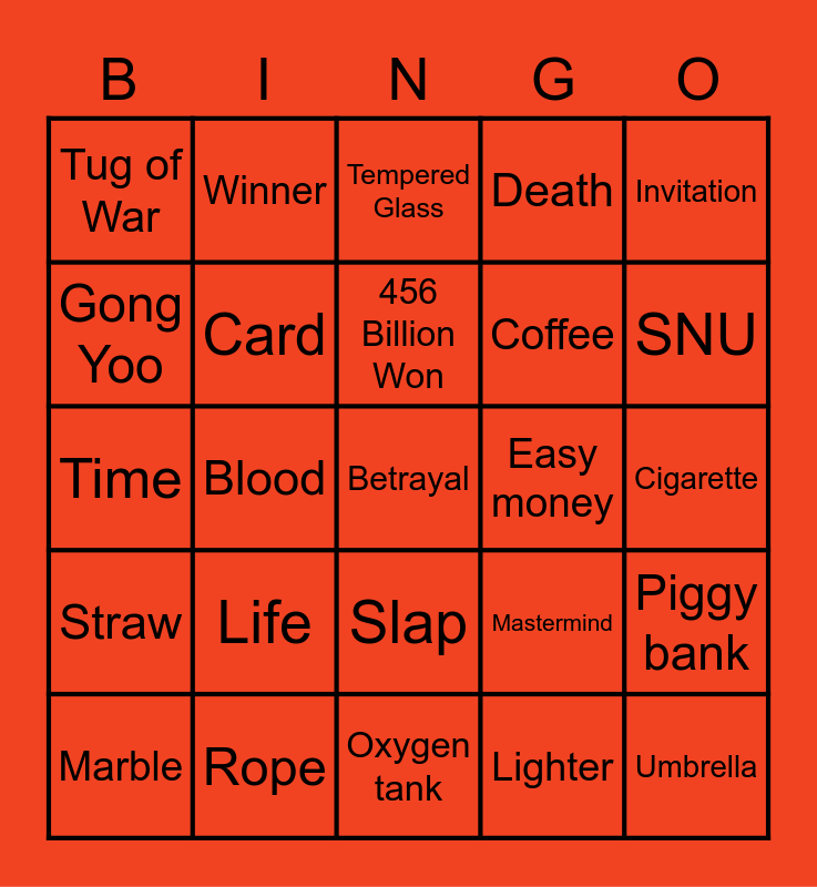 This bingo card has 25 words: Life, Oxygen tank, 456 Billion Won, Marble, Invitation, Tug of War, Gong Yoo, Winner, Easy money, Slap, Coffee, Time, Mastermind, Piggy bank, Card, Umbrella, Cigarette, Tempered Glass, SNU, Blood, Betrayal, Rope, Straw, Death and Lighter.