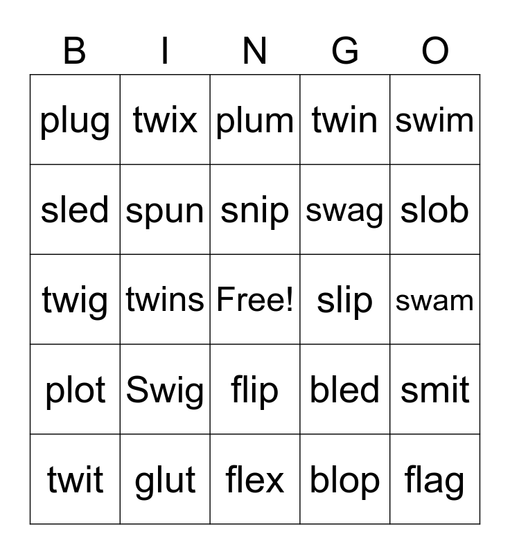 This bingo card has a free space and 24 words: Swig, glut, snip, twit, swim, plug, sled, twix, slip, flip, swag, twig, bled, smit, spun, blop, swam, plum, slob, twins, flag, plot, twin and flex.