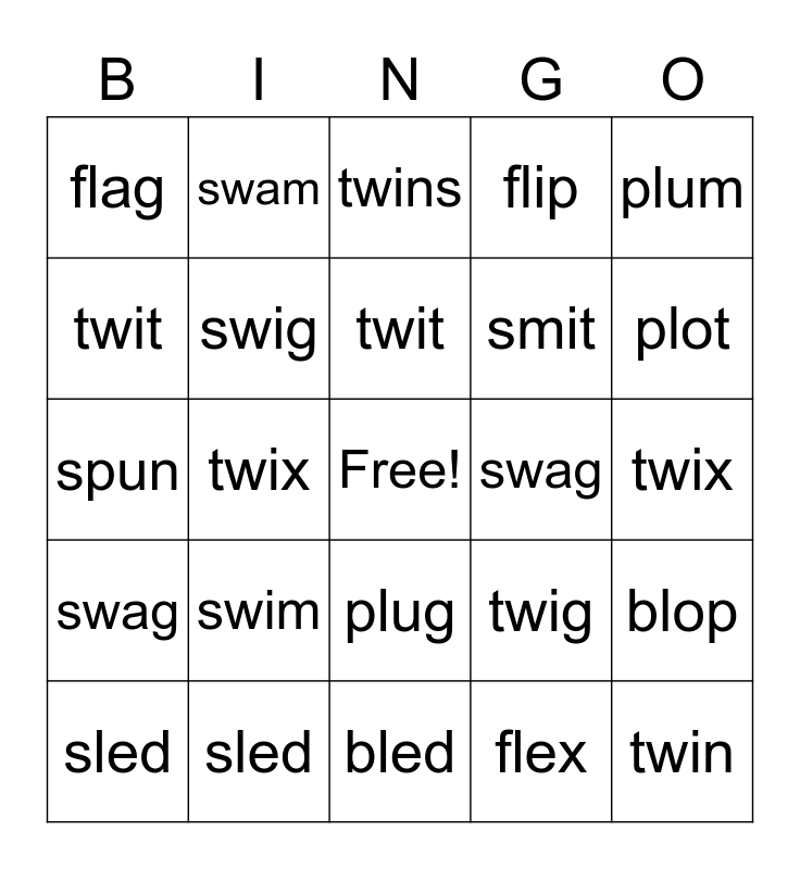 This bingo card has a free space and 24 words: swim, sled, twit, sled, plum, flag, twit, swam, swag, plug, smit, spun, twig, blop, swig, flex, twix, twins, plot, twix, twin, swag, flip and bled.