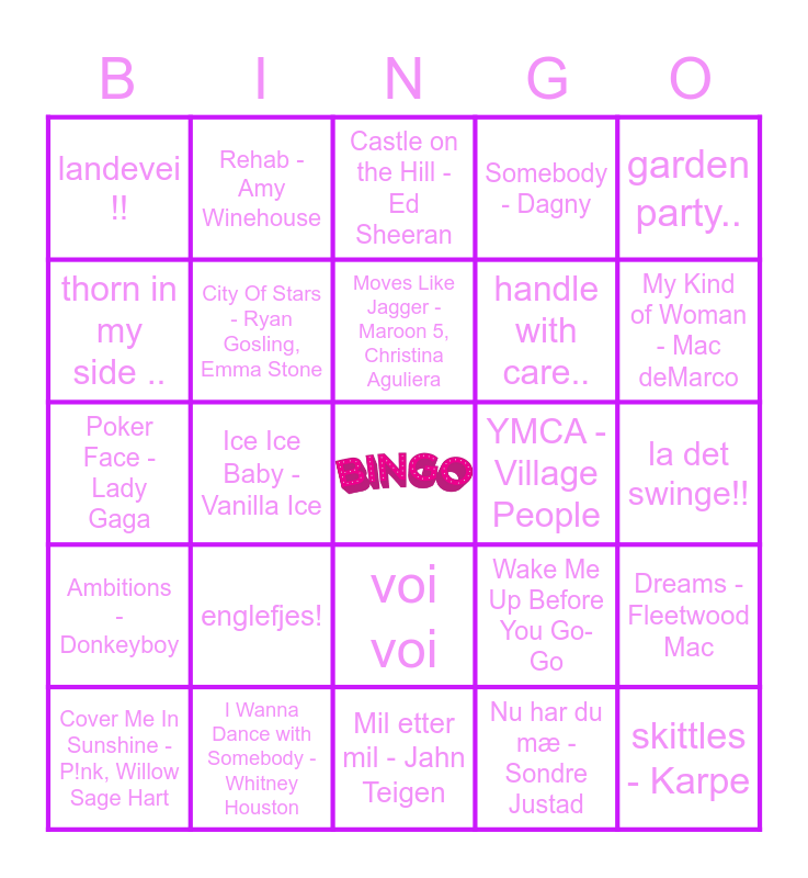 This bingo card has a free space and 63 words: Mamma Mia - ABBA, sommar och sol, Party in the U.S.A - Miley Cyrus, Dreams - Fleetwood Mac, three little birds, Greased Lightnin' - John Travolta, Rehab - Amy Winehouse, jeg kommer snart igjen !, Moves Like Jagger - Maroon 5, Christina Aguliera, we will rock you.., voi voi, the rhythm og love, la det swinge!!, garden party.., free falling !, thorn in my side .., Ice Ice Baby - Vanilla Ice, landevei !!, Smak av honning - deLillos, handle with care.., englefjes!, Ambitions - Donkeyboy, Somebody - Dagny, take on me.., Levitating - Dua Lipa, DaBaby, Serotonin - girl in red, Fireball - Pitbull, John Ryan, Grenade - Bruno Mars, Rolling in the Deep - Adele, TADA - Kjartan Lauritzen, Can You Feel the Love Tonight? - The Lion King, September -Earth, Wind & Fire, Summertime Sadness - Lana Del Rey, New Light - John Mayer, My Kind of Woman - Mac deMarco, Cover Me In Sunshine - P!nk, Willow Sage Hart, Another Brick In The Wall - Pink Floyd, Nu har du mæ - Sondre Justad, All of Me - John Legend, City Of Stars - Ryan Gosling, Emma Stone, Poker Face - Lady Gaga, YMCA - Village People, Rocket Man - Elton John, Øynene lukket - Lars Vaular, Sondre Lerche, skittles - Karpe, I Wanna Dance with Somebody - Whitney Houston, Watermelon Sugar - Harry Styles, Wake Me Up Before You Go-Go, The Best of Both Worlds - Hannah Montana, Fångad av en stormvind - Carola, Survivor - Destiny's Child, Mil etter mil - Jahn Teigen, Hollywood - Cezinando, Save Your Tears - The Weeknd, Peaches - Justin Bieber, Castle on the Hill - Ed Sheeran, Camilla Cabello - Don't Go Yet, Raggen går - F.E.S.T, Raggarbruden, 5 fine frøkner - Gabrielle, God Morgen Norge - Vinnie, Tiktok - Kesha, Snakke Litt - Admiral P and Måndagsban - Veronica Maggio.