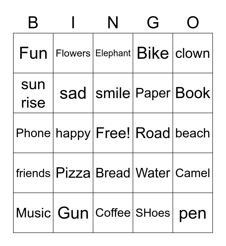 This bingo card has a free space and 39 words: fool, Movie, fun, sad, Music, Bread, smile, House, clown, friends, happy, Bike, pen, beach, Road, Pizza, marker, Fun, Dress, Water, sun rise, Coffee, Paper, Book, jug, bucket, bed, duplicate, Jeep, Flowers, bird, Sea, Elephant, Gun, SHoes, Power, Camel, Phone and charger.