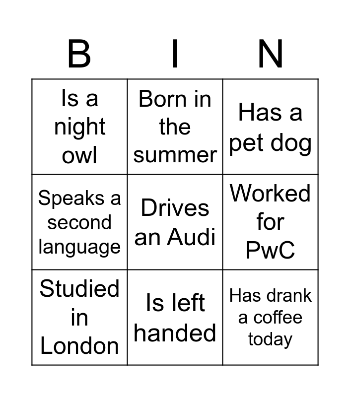 This bingo card has 9 words: Studied in London, Has a pet dog, Born in the summer, Speaks a second language, Is a night owl, Worked for PwC, Drives an Audi, Has drank a coffee today and Is left handed.