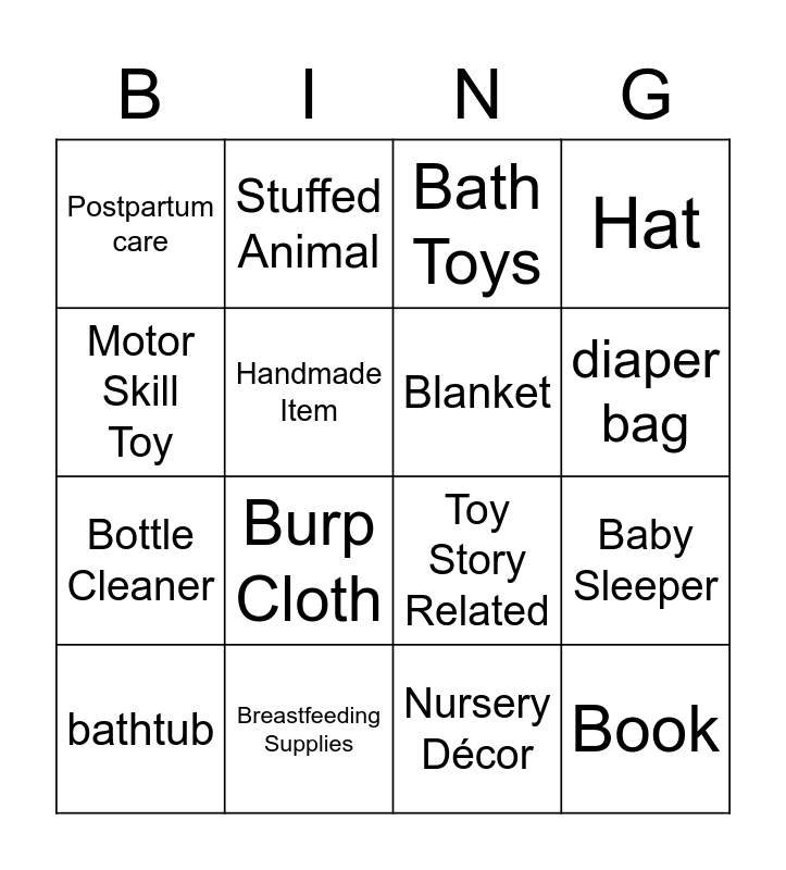 This bingo card has 33 words: Baby Bottles, Wipes, Baby Sleeper, Pacifier, Book, Blanket, Motor Skill Toy, Onesie, Stuffed Animal, Shoes/Socks, diaper bag, Bath Toys, Diapers, Gift Card, Breastfeeding Supplies, Burp Cloth, Graco Brand, Toy Story Related, Baby Powder, Bibs, Mittens, Shampoo, Postpartum care, Nursery Décor, Lotion, bathtub, Hat, Bottle Cleaner, Handmade Item, Wash Cloths, Fridababy Brand, Diaper Cream and Hooded towel.