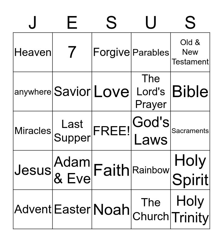 This bingo card has a free space and 24 words: Adam & Eve, Easter, Love, Advent, Old & New Testament, Heaven, anywhere, 7, God's Laws, Faith, The Lord's Prayer, Miracles, Rainbow, Holy Spirit, Savior, The Church, Sacraments, Forgive, Bible, Last Supper, Holy Trinity, Jesus, Parables and Noah.