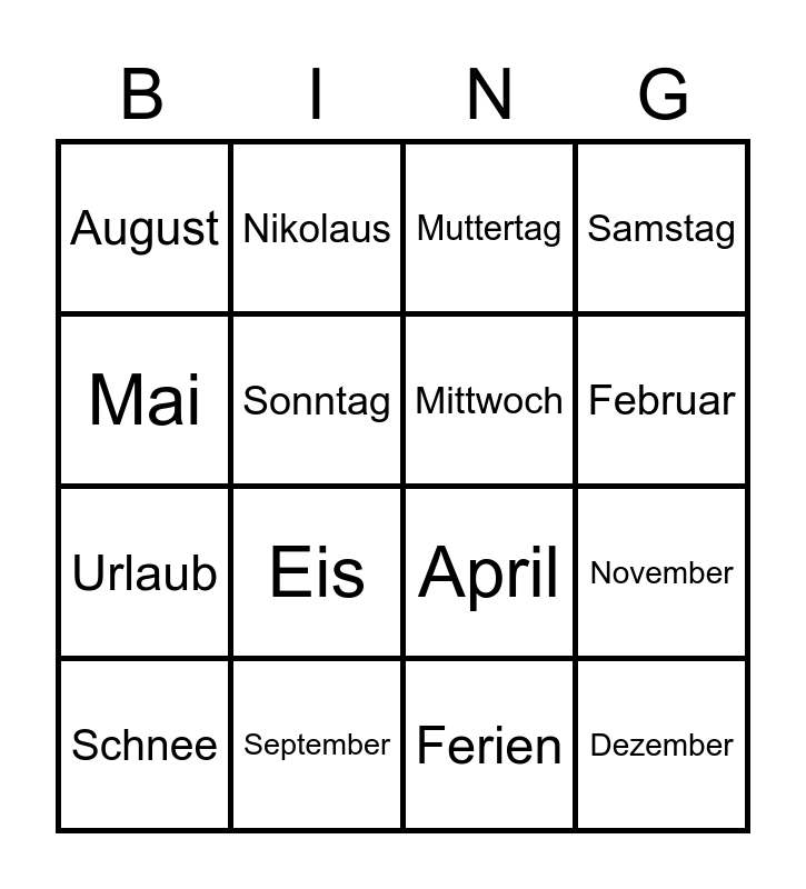 This bingo card has 35 words: Montag, Dienstag, Donnerstag, Mittwoch, Freitag, Samstag, Sonntag, Januar, Februar, März, April, Mai, Juni, Juli, August, September, Oktober, November, Dezember, Schnee, Fasching, Blumen, Wetter, Maibaum, Muttertag, Eis, Erdbeere, Zeugnis, Urlaub, Ferien, Schulanfang, Drachen, Laterne, Nikolaus and Weihnachten.