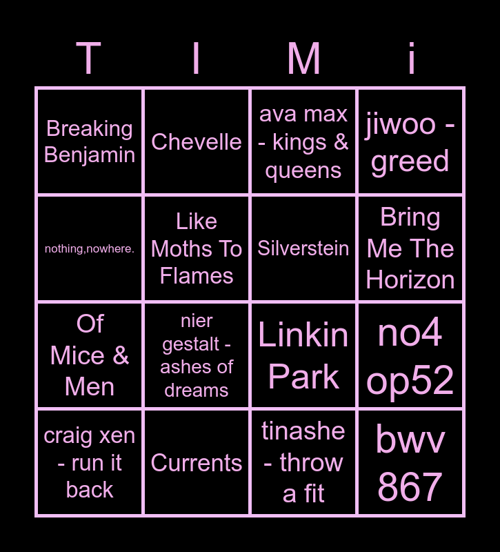 This bingo card has 25 words: Deftones, Invent Animate, Bring Me The Horizon, A Day To Remember, nothing,nowhere., Breaking Benjamin, Like Moths To Flames, Chevelle, Currents, Lil Peep, Of Mice & Men, Linkin Park, Killswitch Engage, Guardin, Silverstein, Green Day, tinashe - throw a fit, ava max - kings & queens, nier gestalt - ashes of dreams, no4 op52, craig xen - run it back, lexie liu - nada, bwv 867, jiwoo - greed and bwv 1052.