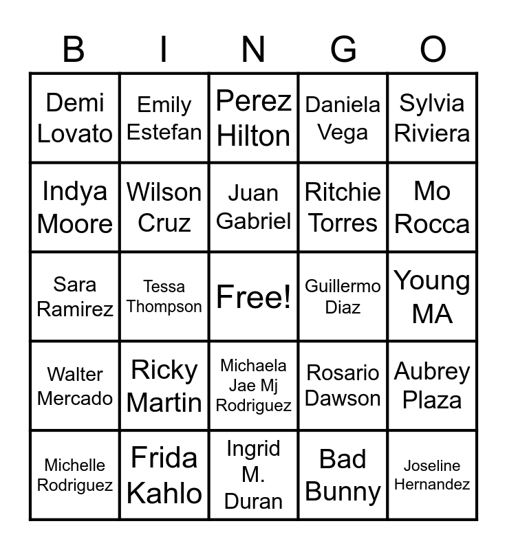 This bingo card has a free space and 24 words: Ricky Martin, Frida Kahlo, Juan Gabriel, Michelle Rodriguez, Sylvia Riviera, Demi Lovato, Indya Moore, Emily Estefan, Guillermo Diaz, Michaela Jae Mj Rodriguez, Ritchie Torres, Sara Ramirez, Rosario Dawson, Aubrey Plaza, Wilson Cruz, Bad Bunny, Young MA, Perez Hilton, Mo Rocca, Tessa Thompson, Joseline Hernandez, Walter Mercado, Daniela Vega and Ingrid M. Duran.