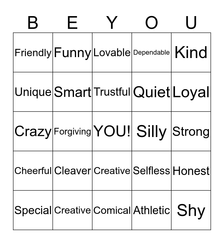 This bingo card has a free space and 24 words: Cleaver, Creative, Trustful, Special, Kind, Friendly, Unique, Funny, Silly, Creative, Quiet, Crazy, Selfless, Honest, Smart, Athletic, Strong, Lovable, Loyal, Forgiving, Shy, Cheerful, Dependable and Comical.