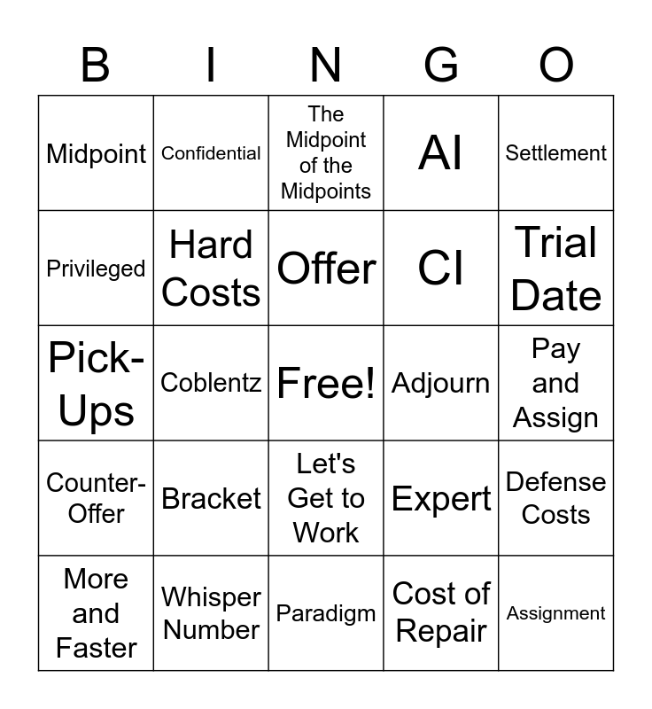 This bingo card has a free space and 24 words: Bracket, Whisper Number, Offer, More and Faster, Settlement, Midpoint, Privileged, Confidential, Adjourn, Let's Get to Work, CI, Pick-Ups, Expert, Defense Costs, Hard Costs, Cost of Repair, Pay and Assign, The Midpoint of the Midpoints, Trial Date, Coblentz, Assignment, Counter-Offer, AI and Paradigm.