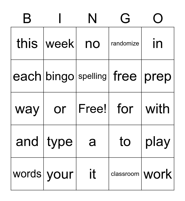 This bingo card has a free space and 24 words: type, your, spelling, words, in, this, each, week, for, a, free, way, to, play, bingo, classroom, with, no, prep, or, work, and, randomize and it.