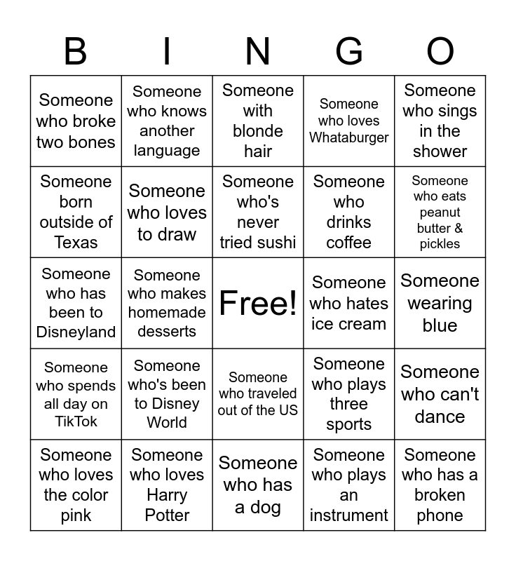 This bingo card has a free space and 24 words: Someone who's been to Disney World, Someone who loves Harry Potter, Someone who's never tried sushi, Someone who loves the color pink, Someone who sings in the shower, Someone who broke two bones, Someone born outside of Texas, Someone who knows another language, Someone who hates ice cream, Someone who traveled out of the US, Someone who drinks coffee, Someone who has been to Disneyland, Someone who plays three sports, Someone who can't dance, Someone who loves to draw, Someone who plays an instrument, Someone wearing blue, Someone with blonde hair, Someone who eats peanut butter & pickles, Someone who makes homemade desserts, Someone who has a broken phone, Someone who spends all day on TikTok, Someone who loves Whataburger and Someone who has a dog.