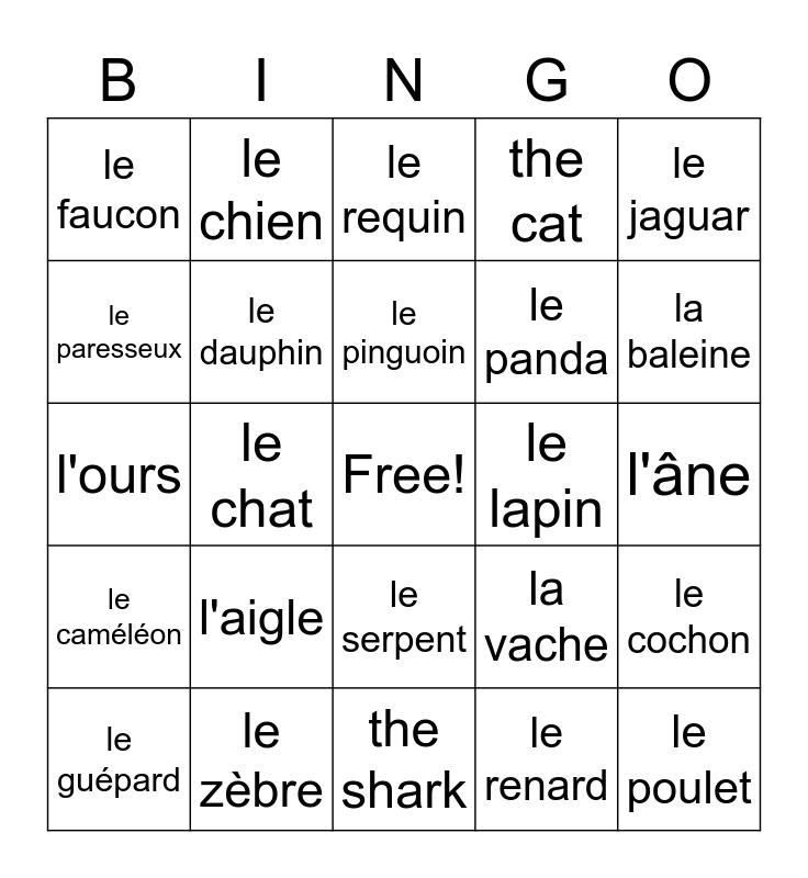 This bingo card has a free space and 24 words: l'aigle, le zèbre, le pinguoin, le guépard, le jaguar, le faucon, le paresseux, le chien, le lapin, le serpent, le panda, l'ours, la vache, le cochon, le dauphin, le renard, l'âne, le requin, la baleine, le chat, le poulet, le caméléon, the cat and the shark.