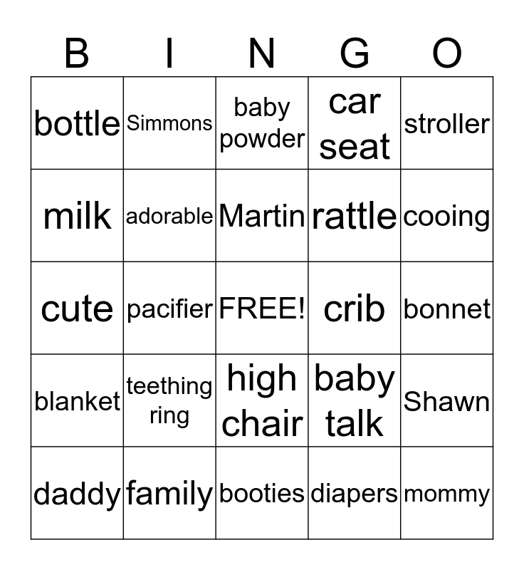 This bingo card has a free space and 29 words: daddy, bibs, pacifier, nap time, bottle, baby powder, adorable, teething ring, crib, family, bonnet, mommy, booties, diapers, cooing, giggles, high chair, blanket, stroller, cute, baby talk, love diaper bag, rattle, milk, car seat, Simmons, Shawn, Martin and newborn.