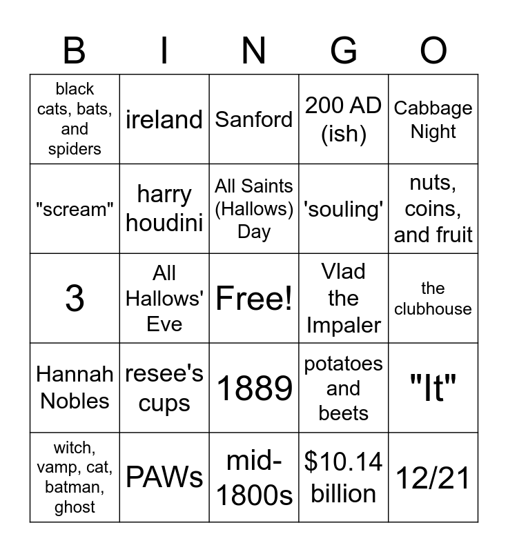 This bingo card has a free space and 49 words: 9/22, 12/21, Anoka, MN 1921, mid-1800s, resee's cups, the celts, ireland, spider-man, "scream", 2nd, harry houdini, 200 AD (ish), "It", potatoes and beets, silly string, Alabama yee yee, All Saints (Hallows) Day, Vlad the Impaler, Central America, Cabbage Night, All Hallows' Eve, $10.14 billion, black cats, bats, and spiders, 'souling', 1950's, nuts, coins, and fruit, witch, vamp, cat, batman, ghost, skittles, 1889, Hannah Nobles, other side of parking lot, 10/28, 7 AM, 6, PAWs, tomorrow!!, tabaco, drugs, underage drinking, Chevene :-), the clubhouse, Chris Pratt & a cute lil velociraptor, Corq/GC connect, Caroline, Kaylee, and Savannah, Terrace & some 1st floor, Bonetilda, 3, Sanford, Bell Hall, The women's college of Georgia and #1.