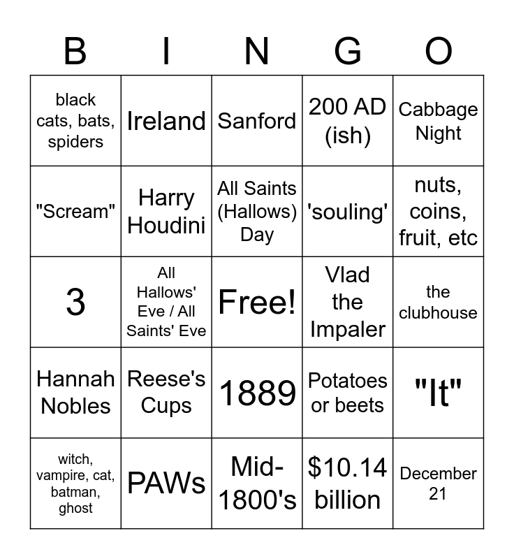 This bingo card has a free space and 49 words: September 22, December 21, Anoka, MN 1921, Mid-1800's, Reese's Cups, The Celts, Ireland, Spider-man, "Scream", 2nd, Harry Houdini, 200 AD (ish), "It", Potatoes or beets, silly string (rip), Alabama (yee yee), All Saints (Hallows) Day, Vlad the Impaler, Central America, Cabbage Night, All Hallows' Eve / All Saints' Eve, $10.14 billion, black cats, bats, spiders, 'souling', 1950's, nuts, coins, fruit, etc, witch, vampire, cat, batman, ghost, skittles, 1889, Hannah Nobles, other side of parking lot, 10/28, 7 AM, 6, PAWs, tomorrow!!, tabaco, drugs, underage drinking, Chevene :-), the clubhouse, Chris Pratt & a cute lil velociraptor, Corq/GC connect, Caroline, Kaylee, and Savannah, Terrace & some 1st floor, Bonetilda, 3, Sanford, Bell Hall, The women's college of Georgia and #1.