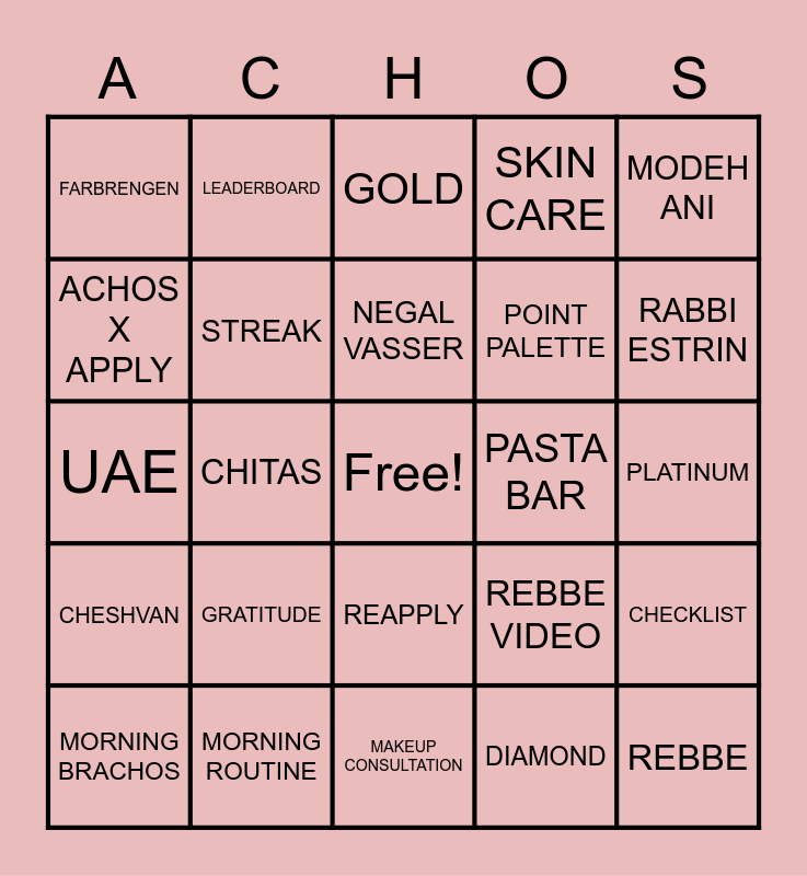 This bingo card has a free space and 24 words: GRATITUDE, MORNING ROUTINE, NEGAL VASSER, MORNING BRACHOS, MODEH ANI, FARBRENGEN, ACHOS X APPLY, LEADERBOARD, PASTA BAR, REAPPLY, POINT PALETTE, UAE, REBBE VIDEO, CHECKLIST, STREAK, DIAMOND, PLATINUM, GOLD, RABBI ESTRIN, CHITAS, REBBE, CHESHVAN, SKIN CARE and MAKEUP CONSULTATION.