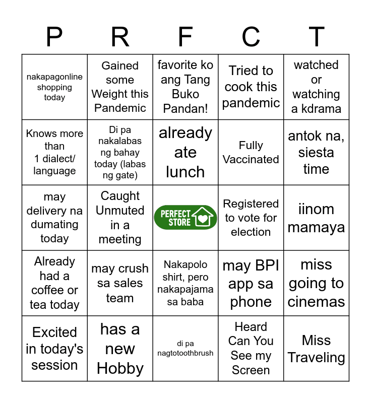 This bingo card has a free space and 24 words: Excited in today's session, may crush sa sales team, already ate lunch, Heard Can You See my Screen, watched or watching a kdrama, nakapagonline shopping today, Gained some Weight this Pandemic, favorite ko ang Tang Buko Pandan!, Registered to vote for election, iinom mamaya, may delivery na dumating today, Di pa nakalabas ng bahay today (labas ng gate), may BPI app sa phone, miss going to cinemas, Knows more than 1 dialect/ language, has a new Hobby, di pa nagtotoothbrush, Tried to cook this pandemic, antok na, siesta time, Already had a coffee or tea today, Caught Unmuted in a meeting, Nakapolo shirt, pero nakapajama sa baba, Fully Vaccinated and Miss Traveling.