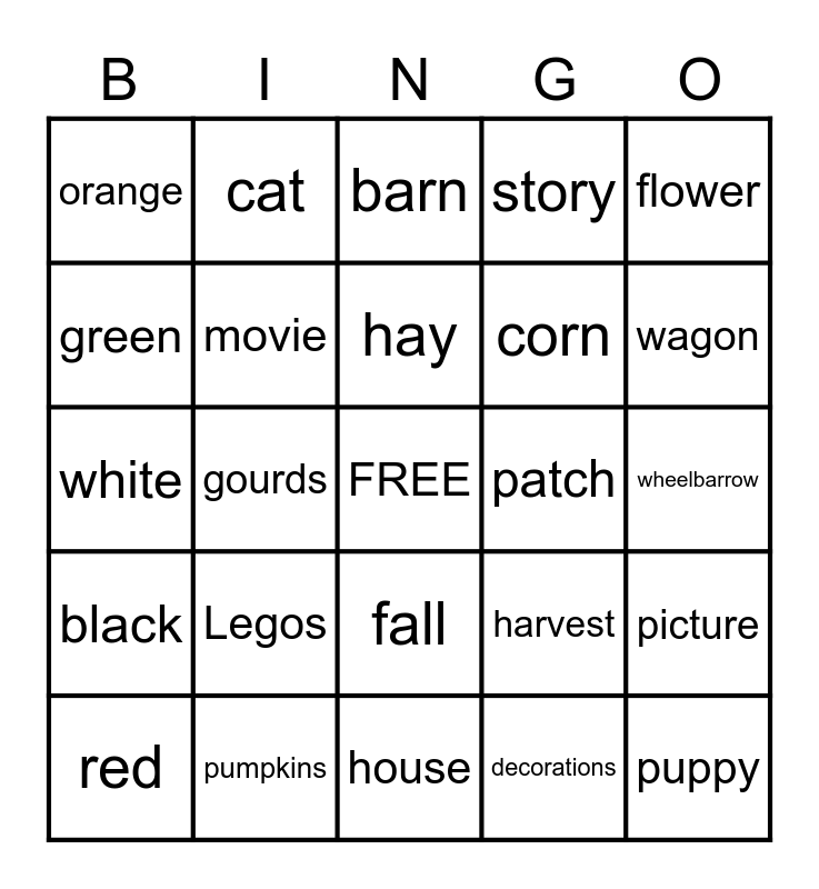 This bingo card has a free space and 24 words: red, Legos, hay, decorations, flower, orange, cat, barn, patch, wheelbarrow, white, movie, harvest, picture, green, pumpkins, house, story, wagon, black, gourds, fall, corn and puppy.