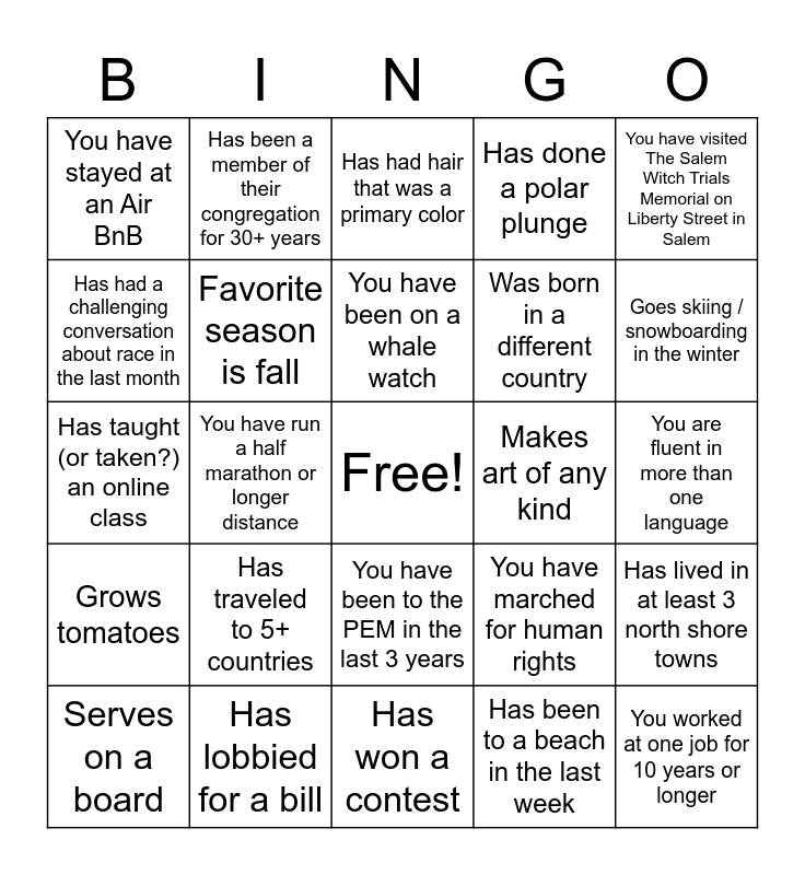 This bingo card has a free space and 28 words: Has lived in at least 3 north shore towns, Has been to 5+ protests in DC, Was born in a different country, Has been to a beach in the last week, Has had a challenging conversation about race in the last month, Has had hair that was a primary color, Has been a member of their congregation for 30+ years, Grows tomatoes, Makes art of any kind, Serves on a board, Has taught (or taken?) an online class, Has done a polar plunge, Has lobbied for a bill, Has won a contest, Goes skiing / snowboarding in the winter, Has written letters to elected officials, Has traveled to 5+ countries, Favorite season is fall, You have been on a whale watch, You have been to the PEM in the last 3 years, You have stayed at an Air BnB, You have dressed up in a costume for Halloween in the past 5 years, You worked at one job for 10 years or longer, You have run a half marathon or longer distance, You are fluent in more than one language, You have marched for human rights, You have visited The Salem Witch Trials Memorial on Liberty Street in Salem and You are a vegetarian.