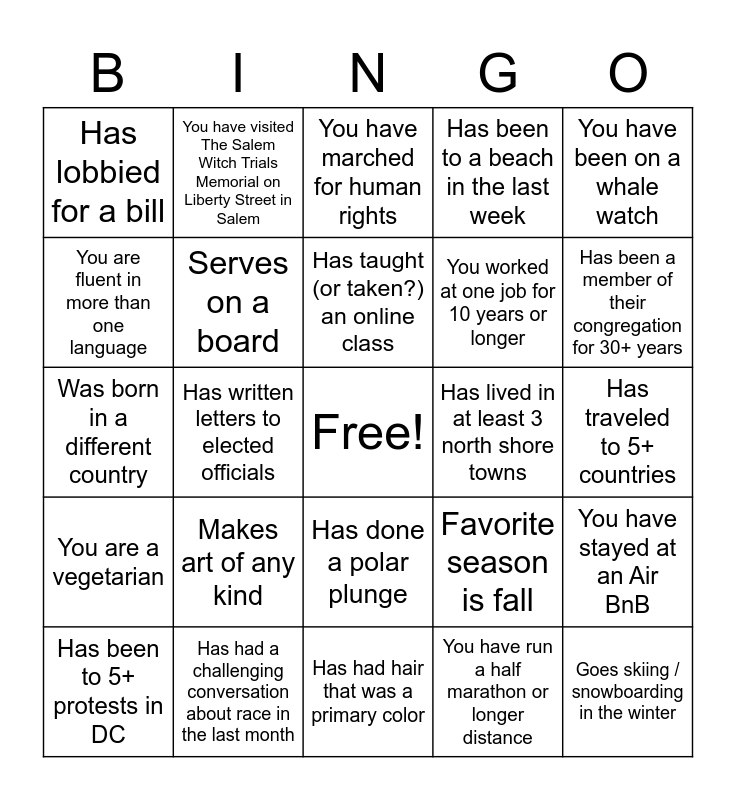 This bingo card has a free space and 28 words: You have stayed at an Air BnB, You have dressed up in a costume for Halloween in the past 5 years, You worked at one job for 10 years or longer, You have run a half marathon or longer distance, You are fluent in more than one language, You have marched for human rights, You have visited The Salem Witch Trials Memorial on Liberty Street in Salem, You are a vegetarian, Has lived in at least 3 north shore towns, Has been to 5+ protests in DC, Was born in a different country, Has been to a beach in the last week, Has had a challenging conversation about race in the last month, Has had hair that was a primary color, Has been a member of their congregation for 30+ years, Grows tomatoes, Makes art of any kind, Serves on a board, Has taught (or taken?) an online class, Has done a polar plunge, Has lobbied for a bill, Has won a contest, Goes skiing / snowboarding in the winter, Has written letters to elected officials, Has traveled to 5+ countries, Favorite season is fall, You have been on a whale watch and You have been to the PEM in the last 3 years.