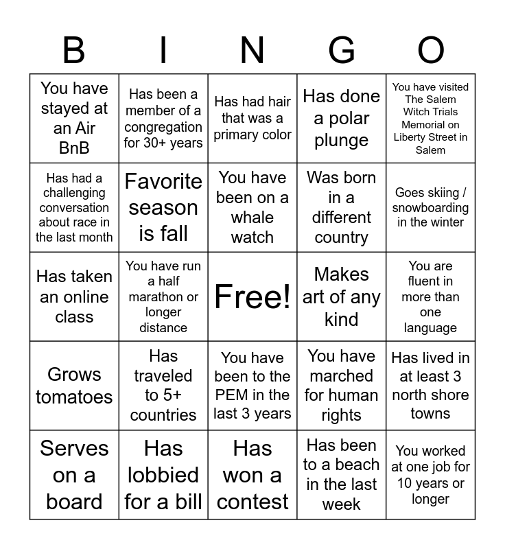 This bingo card has a free space and 28 words: Has lived in at least 3 north shore towns, Has been to 5+ protests in DC, Was born in a different country, Has been to a beach in the last week, Has had a challenging conversation about race in the last month, Has had hair that was a primary color, Has been a member of a congregation for 30+ years, Grows tomatoes, Makes art of any kind, Serves on a board, Has taken an online class, Has done a polar plunge, Has lobbied for a bill, Has won a contest, Goes skiing / snowboarding in the winter, Has written letters to elected officials, Has traveled to 5+ countries, Favorite season is fall, You have been on a whale watch, You have been to the PEM in the last 3 years, You have stayed at an Air BnB, You have dressed up in a costume for Halloween in the past 5 years, You worked at one job for 10 years or longer, You have run a half marathon or longer distance, You are fluent in more than one language, You have marched for human rights, You have visited The Salem Witch Trials Memorial on Liberty Street in Salem and You are a vegetarian.