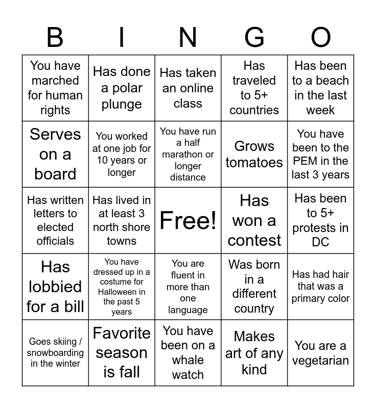 This bingo card has a free space and 28 words: Has had hair that was a primary color, Has been a member of a congregation for 30+ years, Grows tomatoes, Makes art of any kind, Serves on a board, Has taken an online class, Has done a polar plunge, Has lobbied for a bill, Has won a contest, Goes skiing / snowboarding in the winter, Has written letters to elected officials, Has traveled to 5+ countries, Favorite season is fall, You have been on a whale watch, You have been to the PEM in the last 3 years, You have stayed at an Air BnB, You have dressed up in a costume for Halloween in the past 5 years, You worked at one job for 10 years or longer, You have run a half marathon or longer distance, You are fluent in more than one language, You have marched for human rights, You have visited The Salem Witch Trials Memorial on Liberty Street in Salem, You are a vegetarian, Has lived in at least 3 north shore towns, Has been to 5+ protests in DC, Was born in a different country, Has been to a beach in the last week and Has had a challenging conversation about race in the last month.