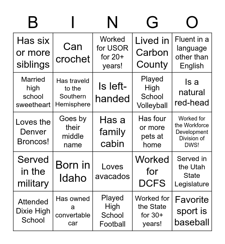 This bingo card has 32 words: Worked for the State for 30+ years!, Graduated from Southern Utah University, Goes by their middle name, Successfully completed a marathon!, Served in the military, Has traveld to the Southern Hemisphere, Fluent in a language other than English, Served in the Utah State Legislature, Can crochet, Favorite sport is baseball, Is left-handed, Worked for USOR for 20+ years!, Free!, Has six or more children, Has four or more pets at home, Has visited one of the Great Lakes, Attended Dixie High School, Loves the Denver Broncos!, Loves avacados, Born in Idaho, Worked for DCFS, Has been employed as a driver, Worked for the Workforce Development Division of DWS!, Has owned a convertable car, Has a family cabin, Lived in Carbon County, Played High School Volleyball, Married high school sweetheart, Has six or more siblings, Played High School Football, Is an only child and Is a natural red-head.
