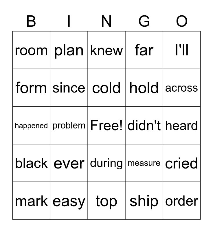 This bingo card has a free space and 29 words: mark, birds, problem, complete, room, knew, since, ever, didn't, easy, heard, order, top, ship, across, today, during, black, I'll, happened, measure, remember, hold, form, far, plan, cried, cold and seen.