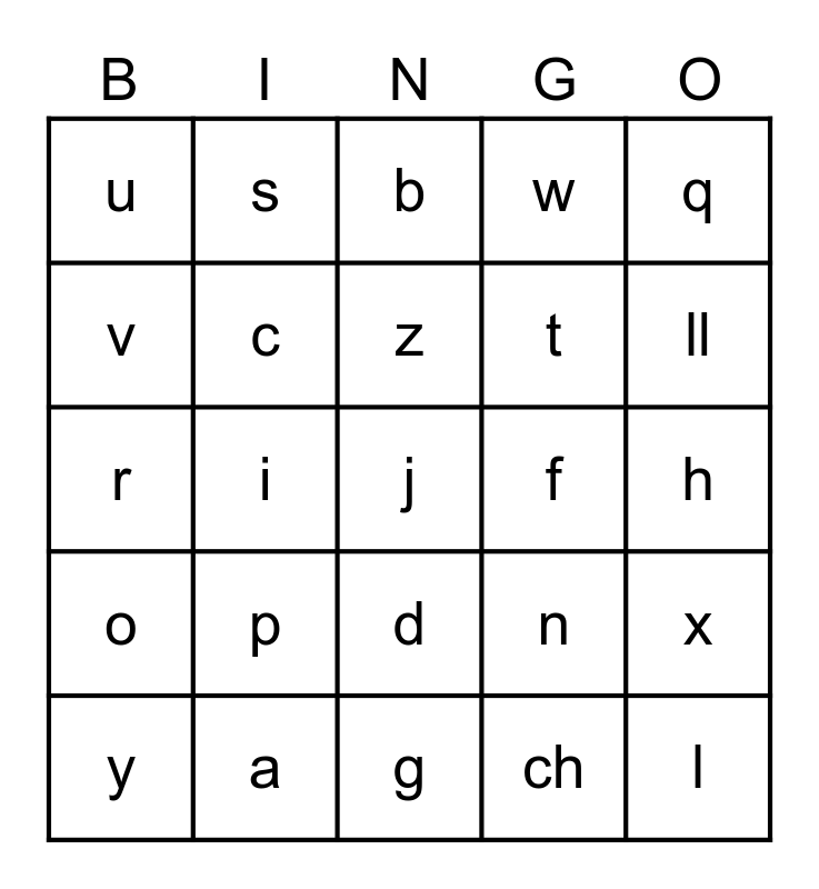 This bingo card has 30 words: a, e, i, o, u, b, c, d, f, g, h, j, ch, l, ll, m, n, o, p, q, r, rr, s, t, v, w, x, y, z and ñ.