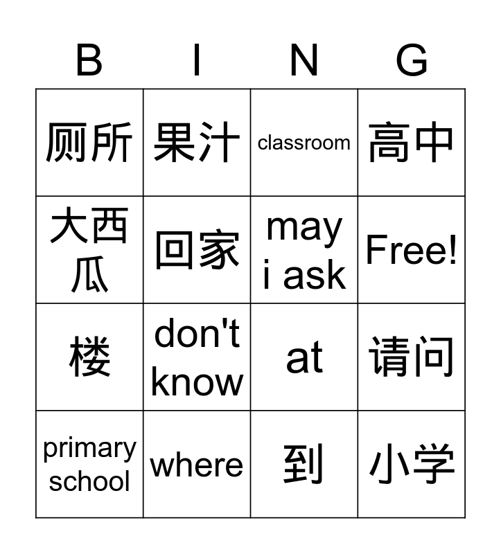 This bingo card has 64 words: 买, 它, 田里, 圆, 可以, 水果, 果汁, 喝, Free!, 唱歌, 香甜, 小猪, 到, 大西瓜, 鞋, 回家, 请问, 厕所, 在哪, 楼, 不客气, 小学, 高中, 办公室, 知道, 澳洲, 国际, 学校, 九龙塘, 到, 主要是, 教室, 操场, know, don't know, tall, middle, high school, toilet, may i ask, at, where, Excuse me, floor, You're welcome, primary school, high school, office, primary, small, Australia, internationality, School, kowloon tong, to, mainly, classroom, playground, swim, book, PE, classroom, teach and hall.