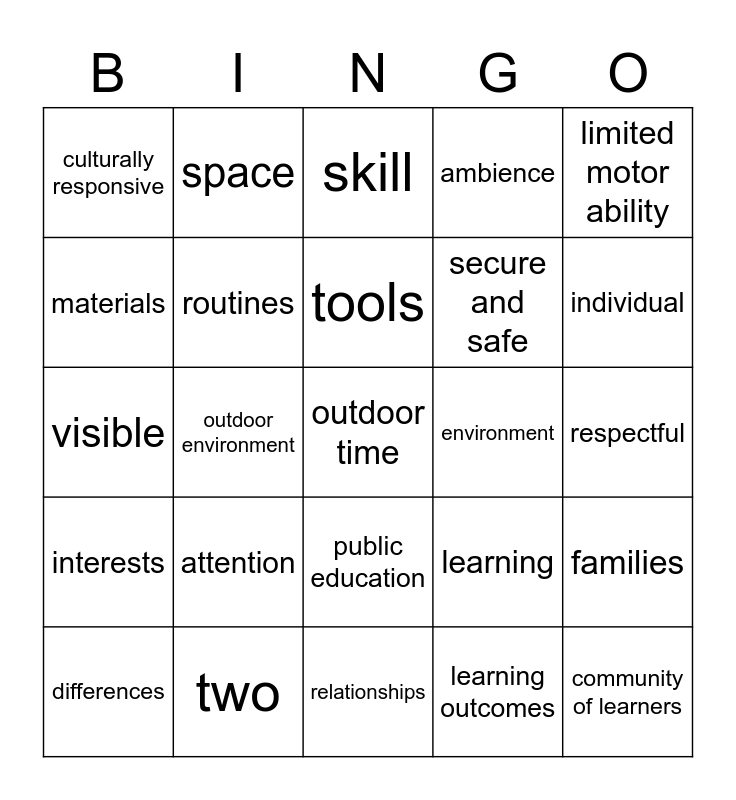 This bingo card has 27 words: learning, community of learners, secure and safe, relationships, materials, skill, space, interests, environment, families, visible, ambience, differences, two, individual, investigate, routines, tools, attention, culturally responsive, respectful, learning outcomes, outdoor environment, outdoor time, public education, limited motor ability and multisensory.