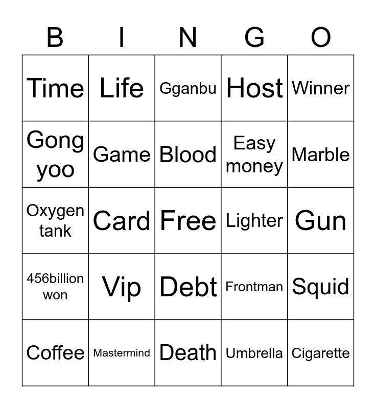 This bingo card has a free space and 25 words: Vip, Death, Blood, Coffee, Winner, Time, Gong yoo, Life, Lighter, Debt, Easy money, Oxygen tank, Frontman, Squid, Game, Triangle, Gun, Gganbu, Marble, Card, Cigarette, Mastermind, 456billion won, Host and Umbrella.