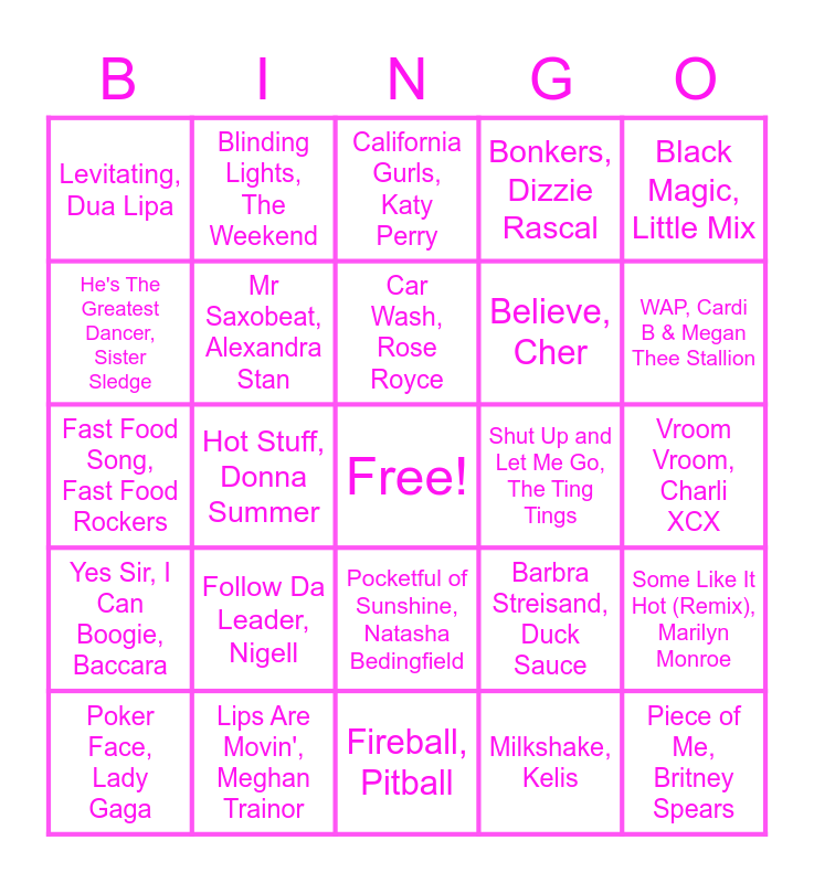 This bingo card has a free space and 44 words: Bye Bye Bye, NSYNC, Piece of Me, Britney Spears, Spinning Around, Kylie Minogue, Poker Face, Lady Gaga, Everytime We Touch, Cascada, Milkshake, Kelis, California Gurls, Katy Perry, Lean On, Major Lazer, Black Magic, Little Mix, Lips Are Movin', Meghan Trainor, Bonkers, Dizzie Rascal, Shut Up and Let Me Go, The Ting Tings, Pocketful of Sunshine, Natasha Bedingfield, Follow Da Leader, Nigell, The Renegade, Friend Within, Fireball, Pitball, MONTERO (Call Me By Your Name), Lil Nas X, Fast Food Song, Fast Food Rockers, Agadoo, Black Lace, WAP, Cardi B & Megan Thee Stallion, Blinding Lights, The Weekend, Dance Monkey, Tones and I, Don't Start Now, Dua Lipa, Levitating, Dua Lipa, Take My Breath, The Weekend, Vroom Vroom, Charli XCX, Everybody's Free, Rozalla, Acceptable in the 80s, Calvin Haris, Barbra Streisand, Duck Sauce, Yes Sir, I Can Boogie, Baccara, Nutbush City Limits, Ike & Tina Turner, Some Like It Hot (Remix), Marilyn Monroe, Born This Way, Lady Gaga, Rasputin, Boney M, Hot Stuff, Donna Summer, Crying at the Discotheque, Sophie Ellis-Bextor, Disco Inferno, Tina Turner, Ring My Bell, Anita Ward, Car Wash, Rose Royce, He's The Greatest Dancer, Sister Sledge, Believe, Cher, Mickey, Toni Basil, Mr Saxobeat, Alexandra Stan and Sweet Dreams (Are Made of These), Eurythmics.