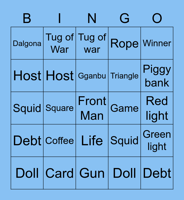⚠ This card has duplicate items: Gganbu (2), Doll (2), Red light (2), Dalgona (2), Gun (2), Circle (2), Host (2), 456 Billion Won (2), Triangle (2), Time (2), Rope (2), Marble (2), Blood (2), Death (2), Gong Yoo (2), Life (2), Winner (2), Square (2), Green light (2), Debt (2), Game (2), Coffee (2), Squid (2)