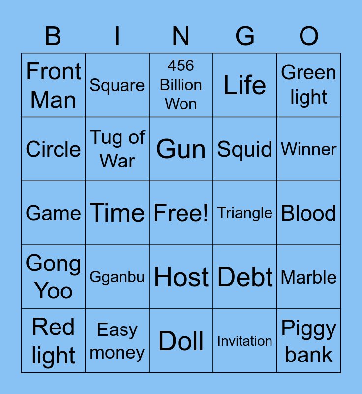 This bingo card has a free space and 25 words: Gganbu, Doll, Gun, Red light, Green light, Front Man, Circle, Square, Triangle, Host, Squid, Game, Debt, Marble, Tug of War, Death, Blood, 456 Billion Won, Winner, Time, Piggy bank, Easy money, Gong Yoo, Life and Invitation.