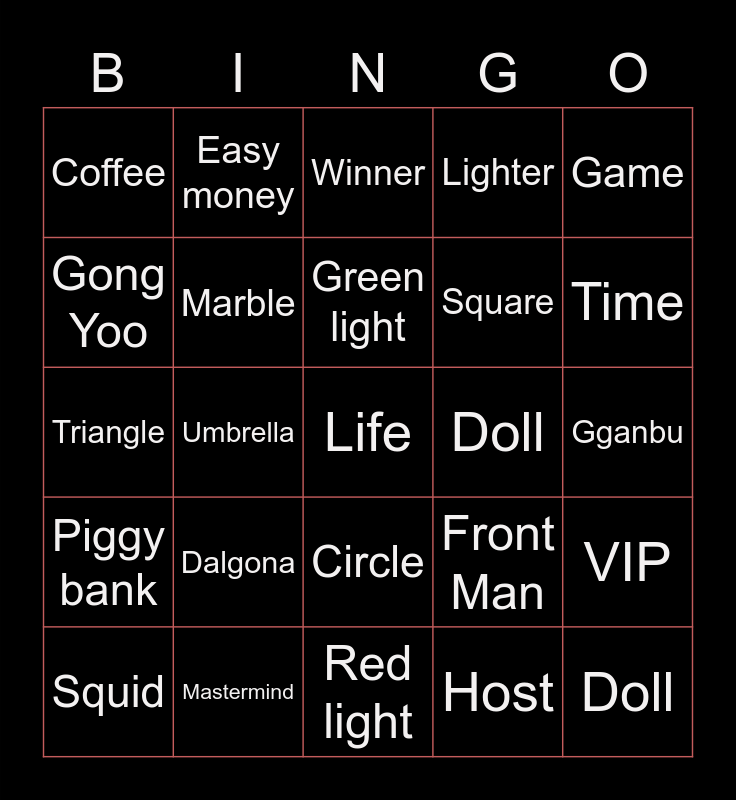 This bingo card has 25 words: Dalgona, Red light, Green light, Squid, Game, Coffee, Gong Yoo, Easy money, Doll, Circle, Square, Triangle, Front Man, VIP, Marble, Doll, Gganbu, Winner, Time, Umbrella, Life, Mastermind, Piggy bank, Lighter and Host.