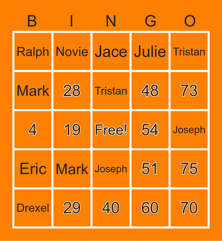 This bingo card has a free space and 154 words: 1, 16, 31, 46, 61, 2, 17, 32, 47, 62, 3, 18, 48, 63, 4, 19, 33, 49, 64, 5, 20, 34, 50, 65, 6, 21, 35, 51, 66, 7, 22, 36, 52, 67, 8, 23, 37, 53, 68, 9, 24, 38, 54, 69, 10, 25, 39, 55, 70, 11, 26, 40, 56, 71, 12, 27, 41, 57, 72, 13, 28, 42, 58, 73, 14, 29, 43, 59, 74, 15, 30, 44, 60, 75, Hermes, Hermes, 45, Hermes, Hermes, Joseph, Joseph, Joseph, Joseph, Joseph, Mark, Mark, Mark, Mark, Mark, Novie, Novie, Novie, Novie, Novie, Ralph, Ralph, Ralph, Ralph, Ralph, Julie, Julie, Julie, Julie, Julie, Quim, Quim, Quim, Quim, Quim, Tristan, Tristan, Tristan, Tristan, Tristan, KZ, KZ, KZ, KZ, KZ, Eric, Eric, Eric, Eric, Eric, Kennie, Kennie, Kennie, Kennie, Kennie, Jace, Jace, Jace, Jace, Jace, JR, JR, JR, JR, JR, Drexel, Drexel, Drexel, Drexel, Drexel, Novy, Novy, Novy, Novy, Novy, Chiza, Chiza, Chiza, Chiza and Chiza.