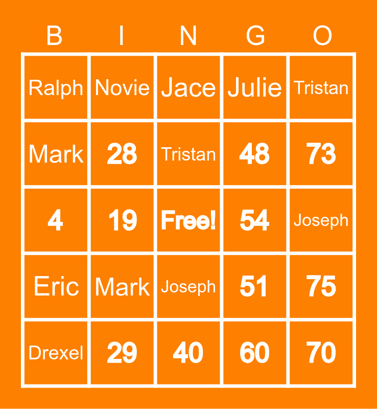 This bingo card has a free space and 154 words: 1, 16, 31, 46, 61, 2, 17, 32, 47, 62, 3, 18, 48, 63, 4, 19, 33, 49, 64, 5, 20, 34, 50, 65, 6, 21, 35, 51, 66, 7, 22, 36, 52, 67, 8, 23, 37, 53, 68, 9, 24, 38, 54, 69, 10, 25, 39, 55, 70, 11, 26, 40, 56, 71, 12, 27, 41, 57, 72, 13, 28, 42, 58, 73, 14, 29, 43, 59, 74, 15, 30, 44, 60, 75, Hermes, Hermes, 45, Hermes, Hermes, Joseph, Joseph, Joseph, Joseph, Joseph, Mark, Mark, Mark, Mark, Mark, Novie, Novie, Novie, Novie, Novie, Ralph, Ralph, Ralph, Ralph, Ralph, Julie, Julie, Julie, Julie, Julie, Quim, Quim, Quim, Quim, Quim, Tristan, Tristan, Tristan, Tristan, Tristan, KZ, KZ, KZ, KZ, KZ, Eric, Eric, Eric, Eric, Eric, Kennie, Kennie, Kennie, Kennie, Kennie, Jace, Jace, Jace, Jace, Jace, JR, JR, JR, JR, JR, Drexel, Drexel, Drexel, Drexel, Drexel, Novy, Novy, Novy, Novy, Novy, Chiza, Chiza, Chiza, Chiza and Chiza.