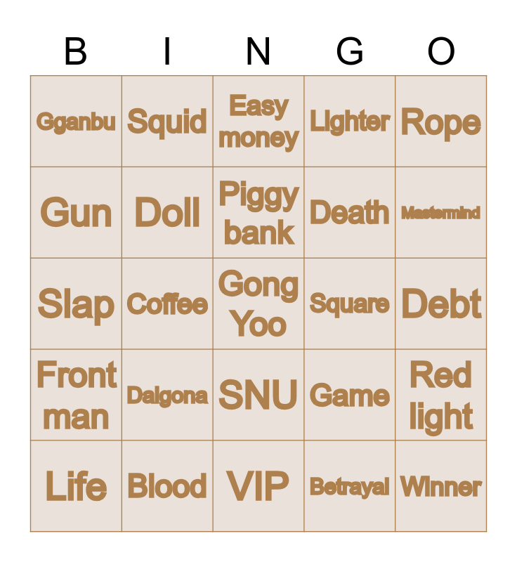 This bingo card has 26 words: SNU, Betrayal, Piggy bank, Blood, Rope, Gganbu, Gun, Squid, Debt, Game, Death, Slap, Red light, Life, Coffee, Straw, Lighter, Front man, Easy money, Gong Yoo, Mastermind, VIP, Square, Dalgona, Doll and Winner.