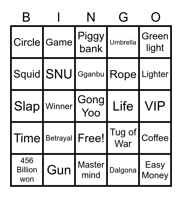 This bingo card has 26 words: Free!, Dalgona, Gganbu, Gun, Green light, Circle, Squid, Game, VIP, Tug of War, Rope, Slap, Coffee, 456 Billion won, Winner, Blood, Umbrella, Time, Piggy bank, Gong Yoo, Lighter, Master mind, Life, Betrayal, SNU and Easy Money.