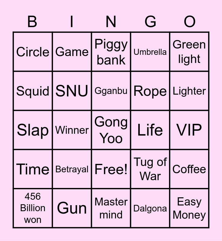This bingo card has 26 words: Free!, Dalgona, Gganbu, Gun, Green light, Circle, Squid, Game, VIP, Tug of War, Rope, Slap, Coffee, 456 Billion won, Winner, Blood, Umbrella, Time, Piggy bank, Gong Yoo, Lighter, Master mind, Life, Betrayal, SNU and Easy Money.